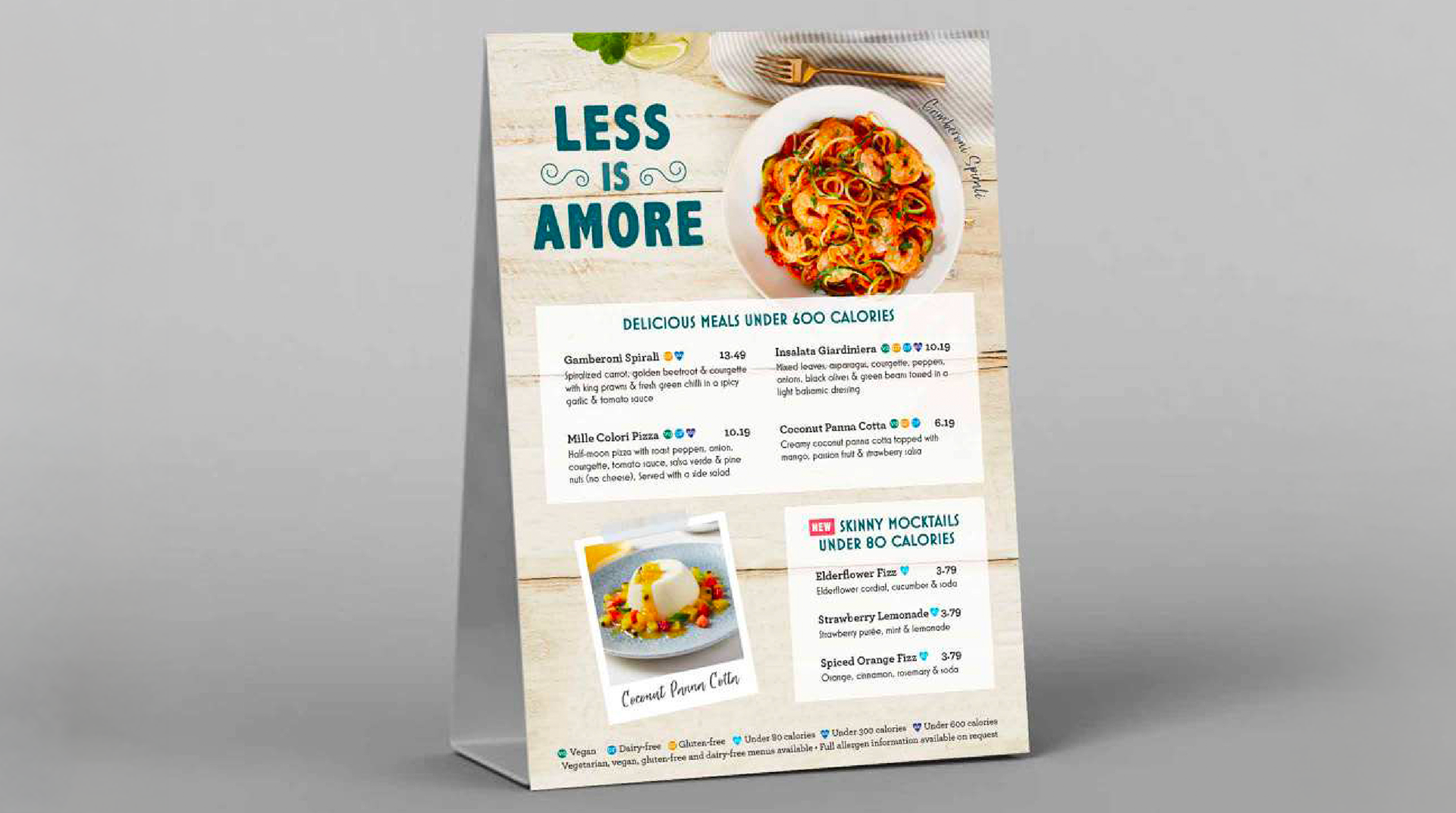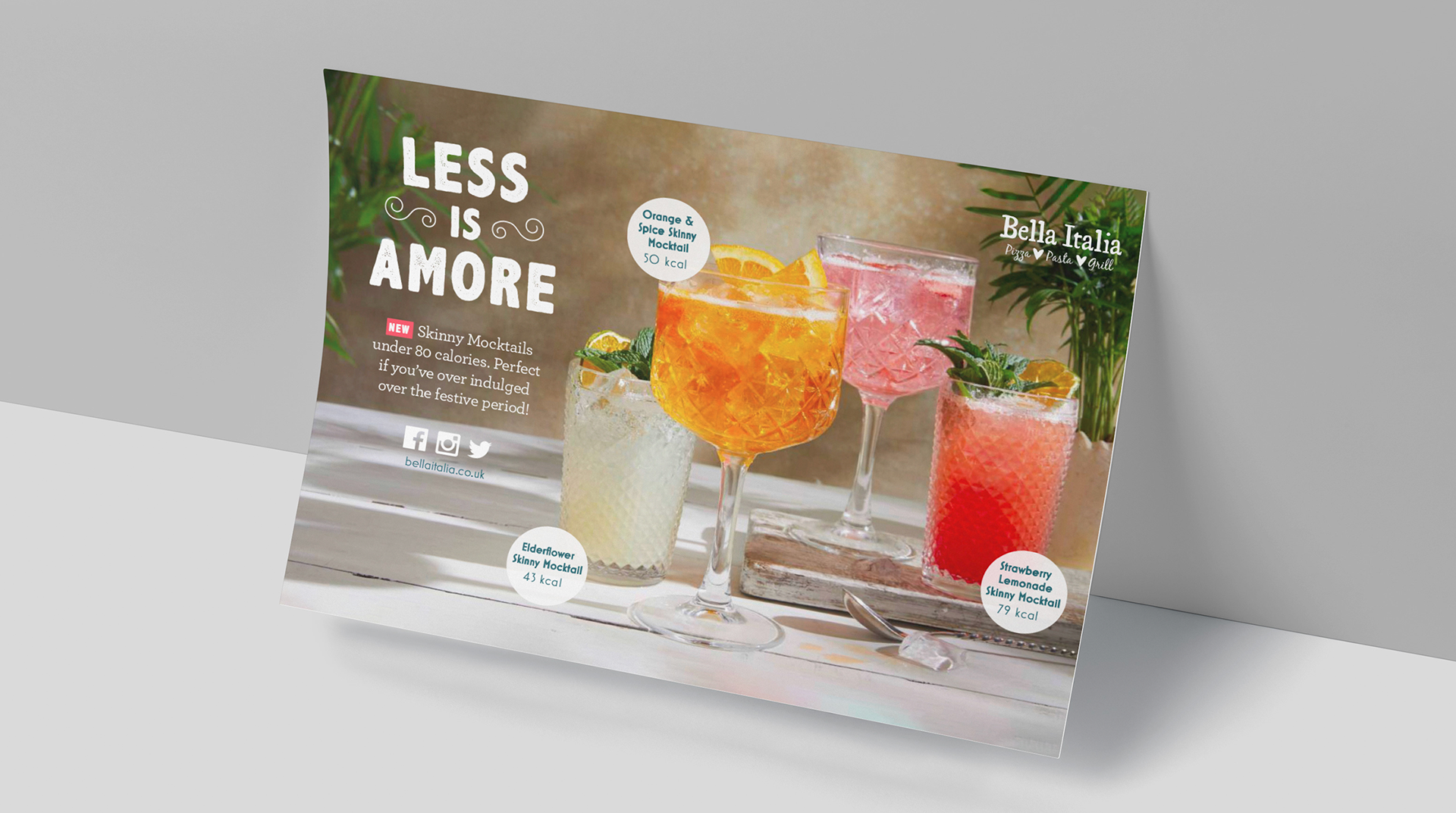 Print materials developed for Bella Italia’s Less Is Amore campaign, highlighting a selection of lighter, lower-calorie dishes across the menu. Working within the brand’s existing guidelines, the project involved designing a range of campaign assets using the supplied photography.